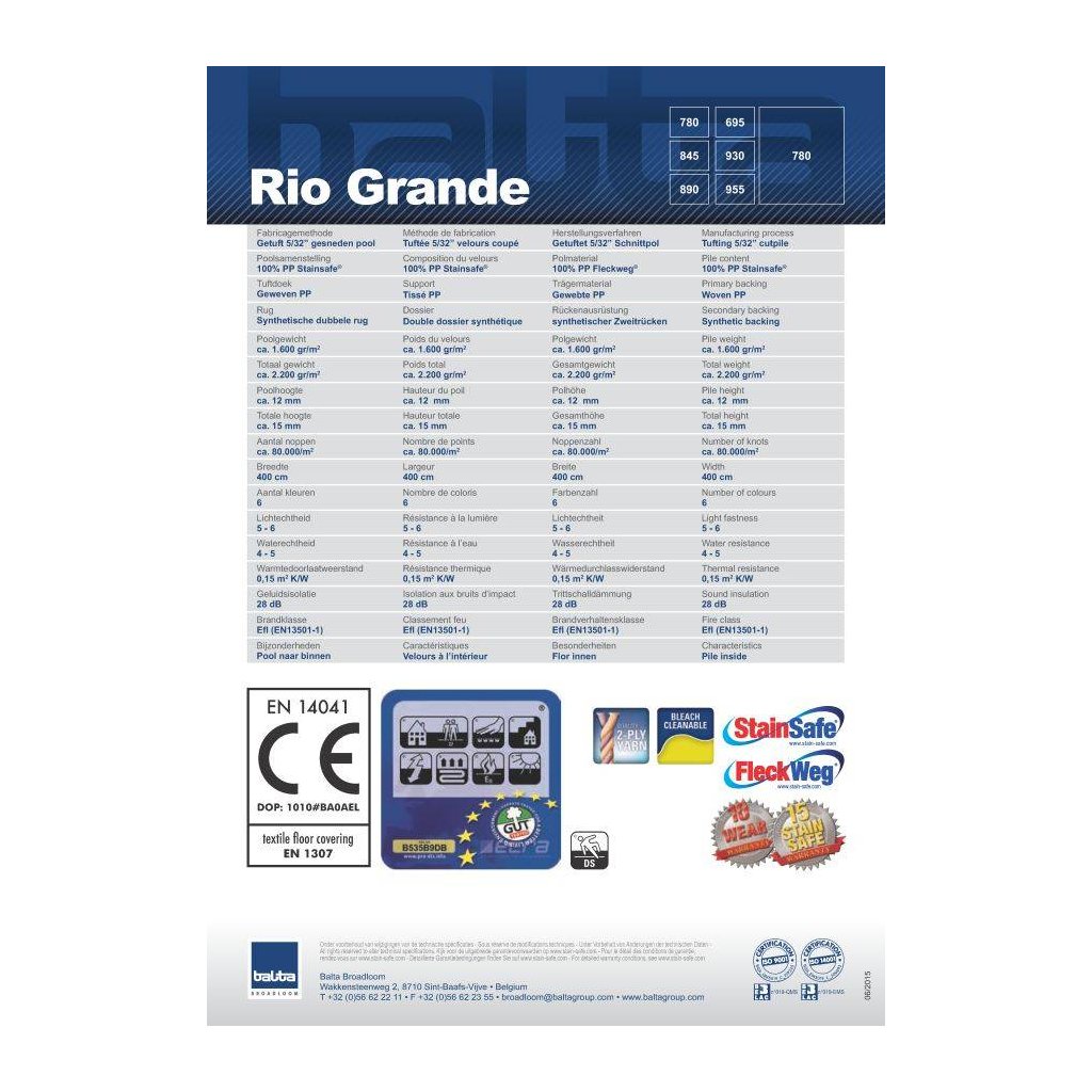Luxusní koberec Rio Grande má moderní vzhled se směsí měkkých a teplých barev. Je 15 mm silný s hustým vpichem. Vyrobený z polypropylenu odolného proti skvrnám - Stainsafe. Tento koberec má dvojité saxony vlákno, což znamená, že každý vpich má dvě různé barvy propletené dohromady. To vytváří flekovanou texturu, která přidává hloubku vaší podlaze.