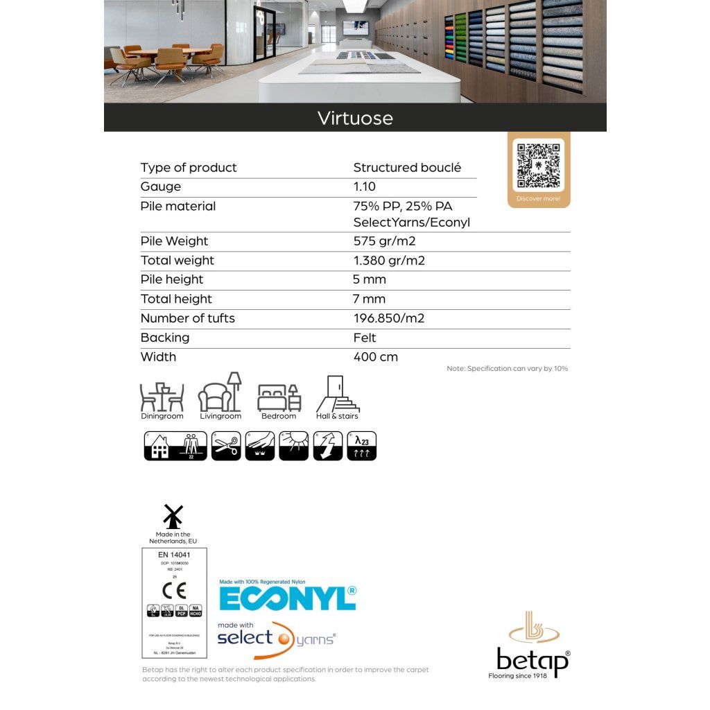 Tento odstín z kolekce VIRTUOSE zaujme svou hnědou barvou doplněnou o decentní vícebarevné smyčky. Melírovaný puntíkovaný efekt dodává koberci živý, ale stále elegantní charakter, který prostor krásně prohřeje a zároveň opticky skryje drobné nečistoty. Díky této hravé, avšak decentní barevnosti se koberec skvěle hodí do obývacího pokoje, dětského pokoje či pokoje pro hosty. Dokáže interiér zútulnit a dodat mu příjemnou atmosféru. Smyčkový vlas se snadno udržuje a koberec je doplněn o kvalitní filcový podklad, který přispívá k lepší akustice a pocitu tepla.