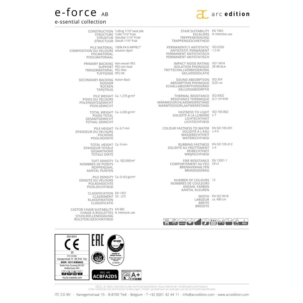Hluboký a lákavý koberce s twistovaným vlasem ve dvoubarevném provedení, e-force přináší klasický styl do komerčních prostor. S širokou škálou barev, které odolávají skvrnám a nevyblednou na slunci, je e-force vysoce výkonnou kvalitou, která je ideální pro vytvoření bohaté a přívětivé atmosféry v místech s vysokou zátěží. Přineste dlouhotrvající luxus s odolností e-force.
